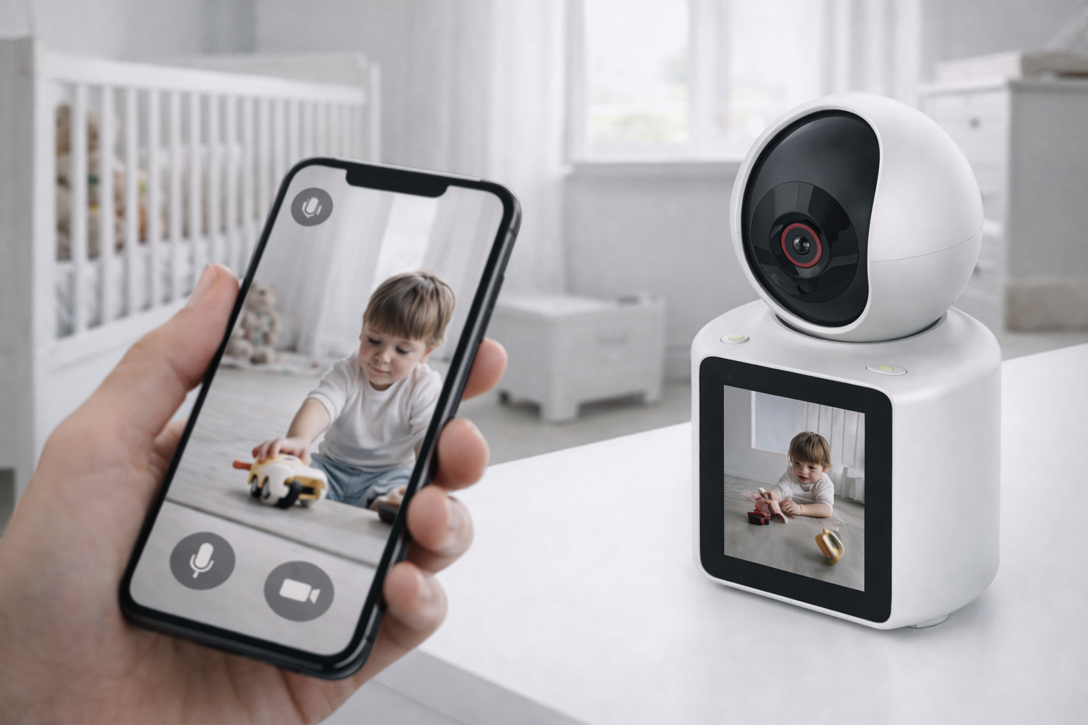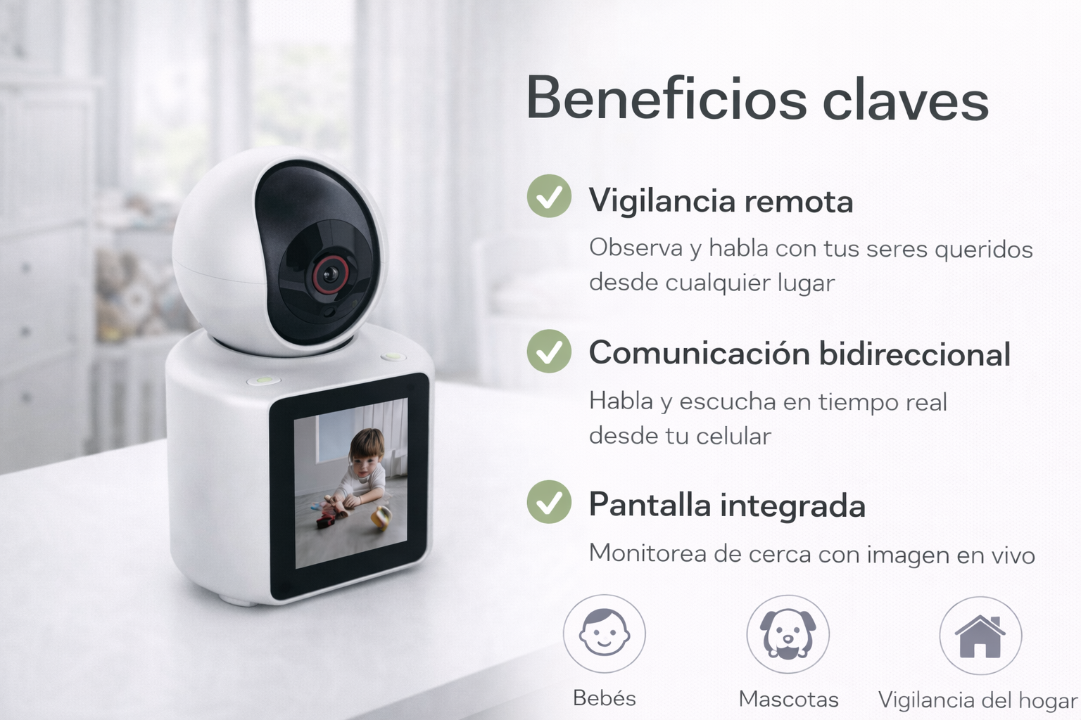 El Monitor Inteligente con Cámara y Pantalla Integrada te permite vigilar a tu bebé, mascota o tu hogar de forma sencilla y segura. Su cámara ofrece una vista clara y su pantalla incorporada te permite monitorear directamente desde el dispositivo, brindándote tranquilidad inmediata.